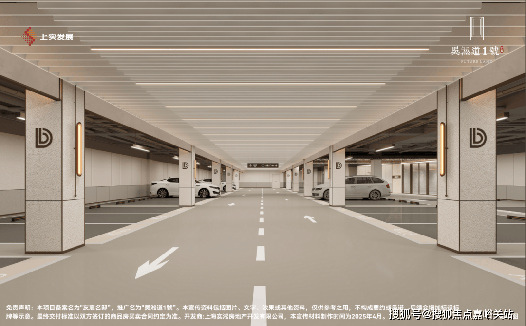 当多数地库还停留在满足基础功能性阶段,吴淞道1號已将车库升维成艺术归家剧场。相比传统车库窄车道与压抑管线米宽阔车道搭配格栅吊顶,利落线条消解逼仄感,行车视野更开阔,会车更轻松从容。